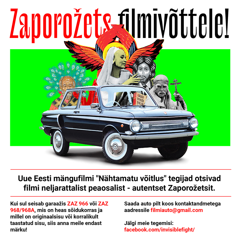 Uus Eesti mängufilm otsib ZAZ966 või ZAZ968/968A autot võtete jaoks. Oleme levitanud kuulutust ja saanud igasugu toredaid rendipakkumisi. Aga soovime kindlasti ka ühte autot osta. Ideaalis ostame ühe auto stunts võtte jaoks ja rendime teise samasuguse lähiplaanide jaoks. Eelisjärjekorras otsime punast aga ka teised erksad värvid sobivad. Autod peavad olema sõidukorras.